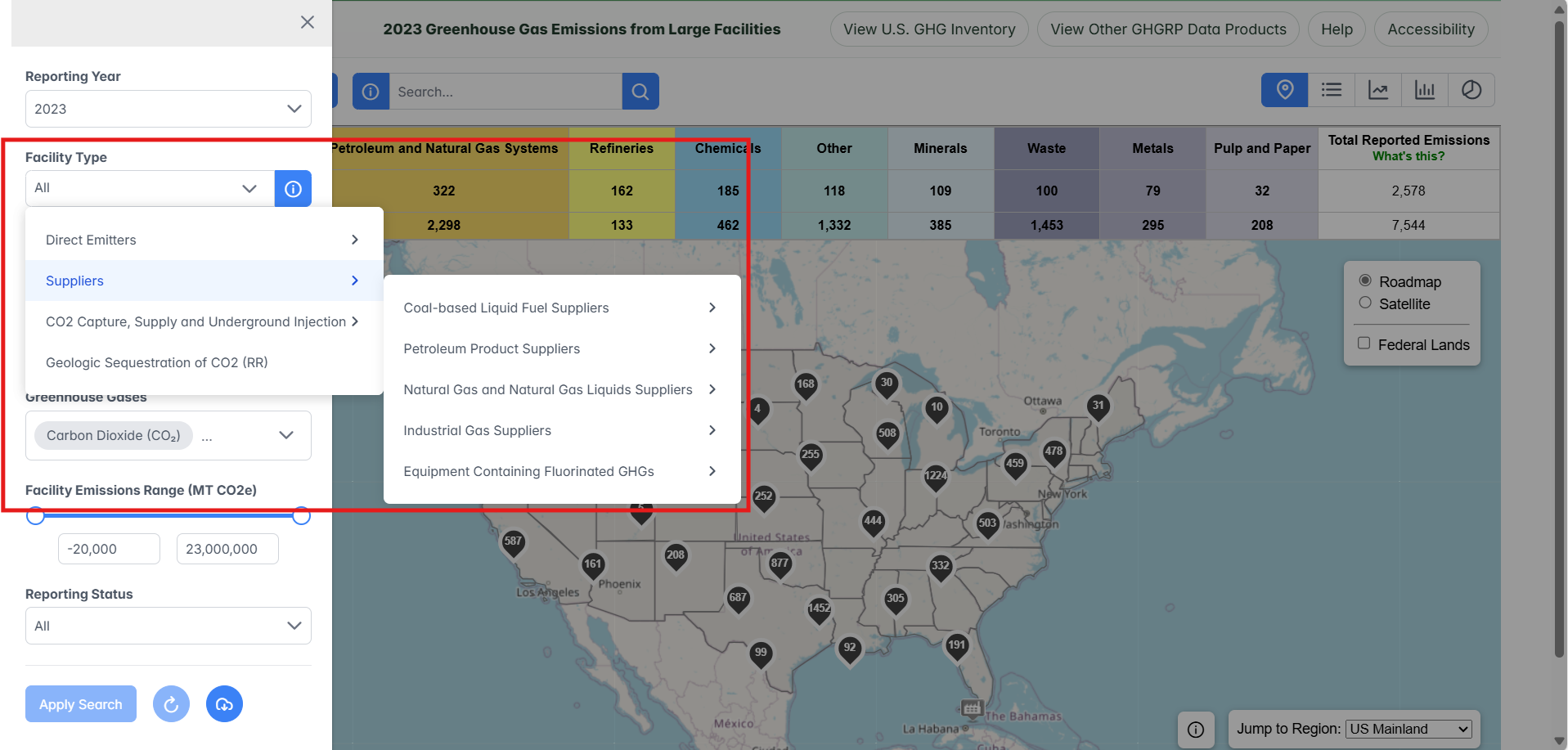 The default view in FLIGHT shows GHG emissions reported by direct emitters. This page provides step-by-step instruction for finding data from other types of facilities.